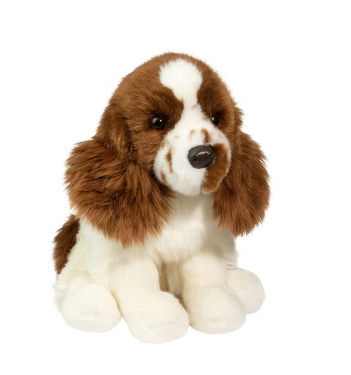 Bring home a spirited Spaniel of your very own with Chip, our Springer Spaniel stuffed animal! This rambunctious breed has charmed people around the world with their excitable personalities and beautiful feathered coats. Chip features a liver and white coat made with soft, plush materials. Feathering at his legs and long-haired detailing on Chip’s ears add to his realism. Our Springer pup’s huggable body style is weighted with beans in his bottom and paws and filled with silky polyester fibers for a resilience that will bounce back after every cuddle. Freckles across his snout and a soft, leatherette nose add the final touches to our handsome plush Springer Spaniel dog!