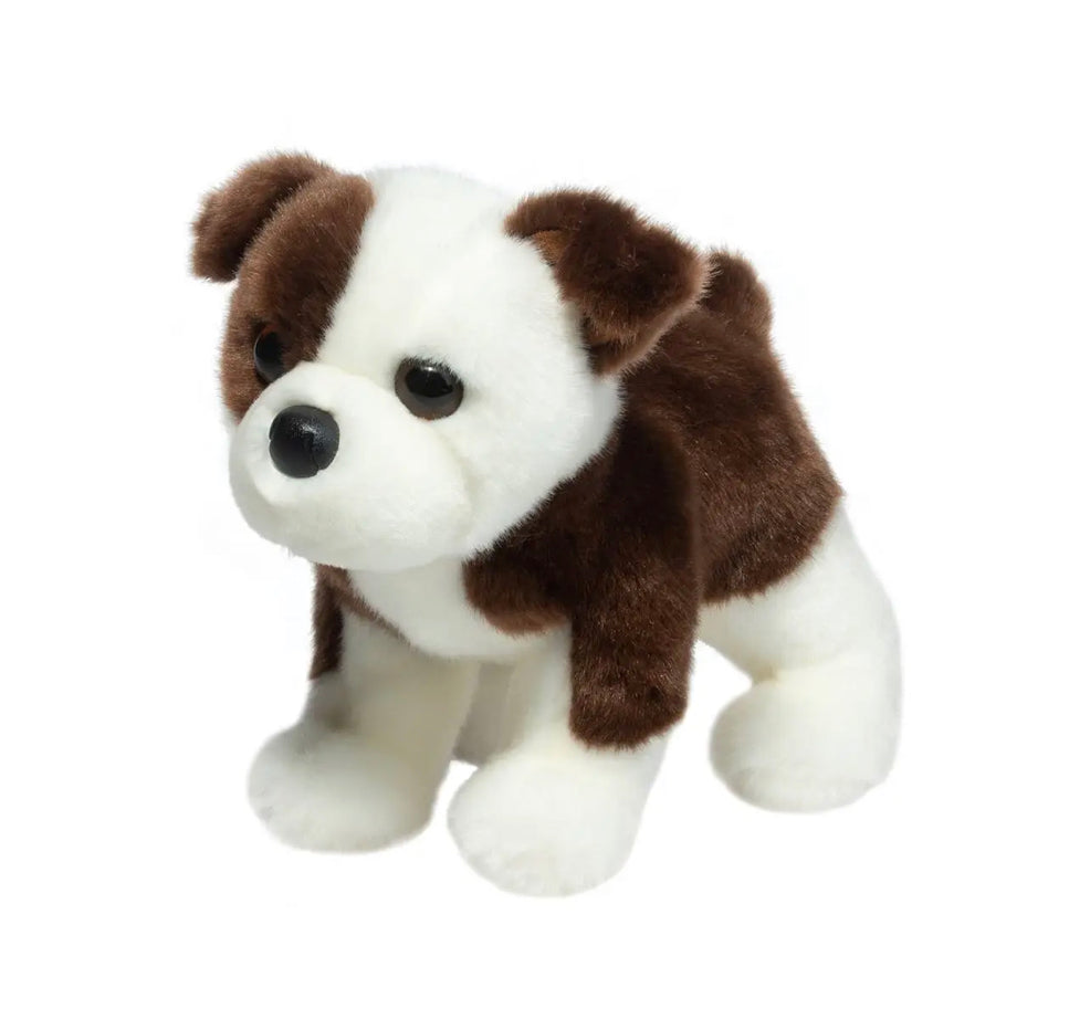 Brimming over with endearing Bulldog puppy charm, Clive is our plush rendition of this courageous breed! Developed in England in the Middle Ages, the Bulldog has become the laid back, playful family pet that we know today Clive’s design captures the stocky body and small floppy ears that one would expect from the breed. The compact shape of Clive’s head features a stout muzzle and large, brown eyes. Chocolate colored spots pattern his short plush coat of white fur. His stand up pose is supported by soft, resilient polyester fiber that allows durability while still retaining huggable softness. Adopt Clive the Bulldog puppy stuffed animal, his winsome personality will make him an instant favorite!!