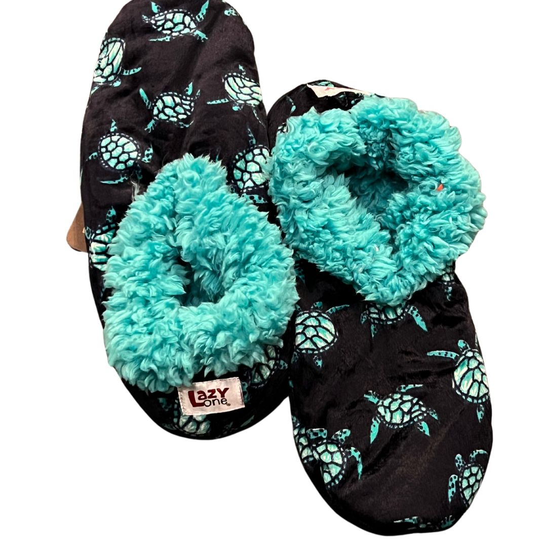 Like turtles? Ever wish you could be wearing slippers with turtles on them? Look no further than our cute and cozy Turtle fuzzy feet slippers. With a thick, fleecy lining on the inside and a soft fleece on the outside, these slippers are the very definition of "comfy!" So when it's time to tread softly, look no further than your Fuzzy Feet! (non-skid on sole.)